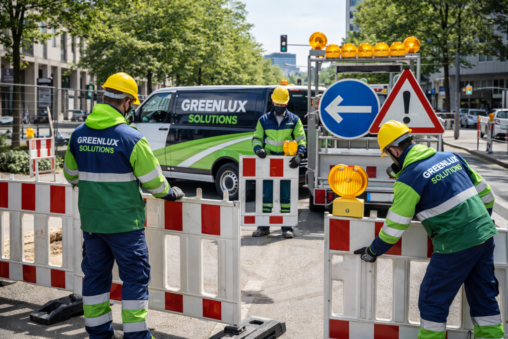 Ergänzend bieten wir Verkehrssicherungsmaßnahmen für Baustellen, Betriebsareale und temporäre Maßnahmen: Absperrungen, Beschilderung, Sicherung von Gefahrenstellen sowie die ordnungsgemäße Absicherung während laufender Arbeiten – für den Schutz von Mitarbeitern, Besuchern und Dritten.